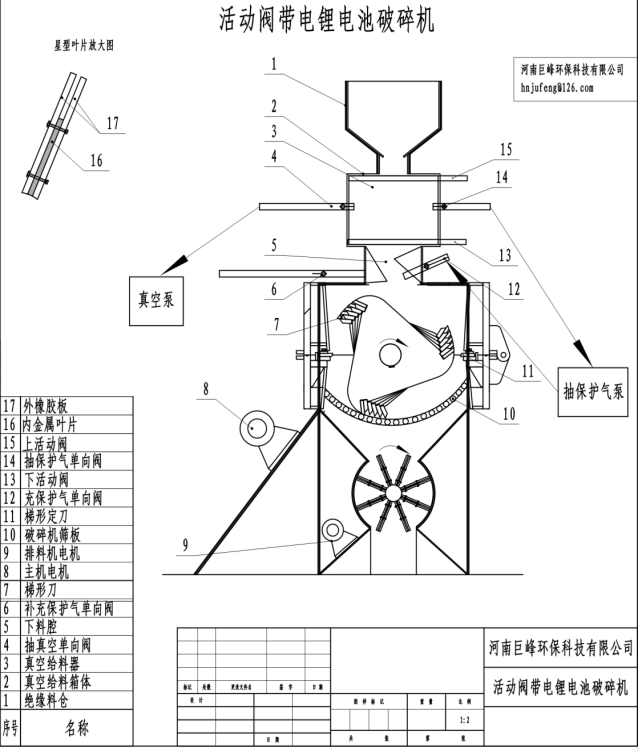 鋰電池經(jīng)絕緣倉進(jìn)活動(dòng)閥真空給料,下閥關(guān)上閥開,進(jìn)料后上閥關(guān),關(guān)后抽空,抽后下閥開入破室,下閥關(guān)給料器腔抽氣,完成給料工序;物料經(jīng)Z腔至破室,Z腔防止物料反彈,破室在貧氧狀(破碎室含氧量在小于2%以下可保證帶電破碎的正常安全性),破室進(jìn)出料閉氧抽空充惰性氣體(常規(guī)用氮?dú)夂投趸迹欢栊詺怏w作用為提高電解液閃點(diǎn)和揮發(fā)點(diǎn),同時(shí)抑制鋰離子從負(fù)極到正極幾率,防止放電發(fā)熱和爆燃;鋰電破碎時(shí)轉(zhuǎn)子刀與底刀相切破,并起摩擦打散防止金屬殼體包裹正負(fù)極片,碎后物料通過真空排料進(jìn)行外排。