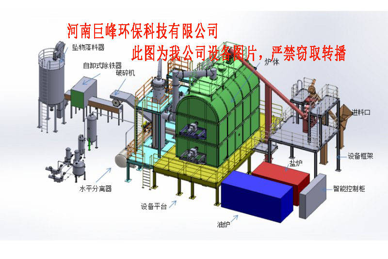 無氧裂解系統(tǒng)性中產(chǎn)生的可燃?xì)馀c破碎分選產(chǎn)生的廢氣進(jìn)行互補(bǔ),在燃燒室中充分燃燒,達(dá)到廢氣相互燃燒和充分利用,使燃燒后的尾氣處理比較簡(jiǎn)單。