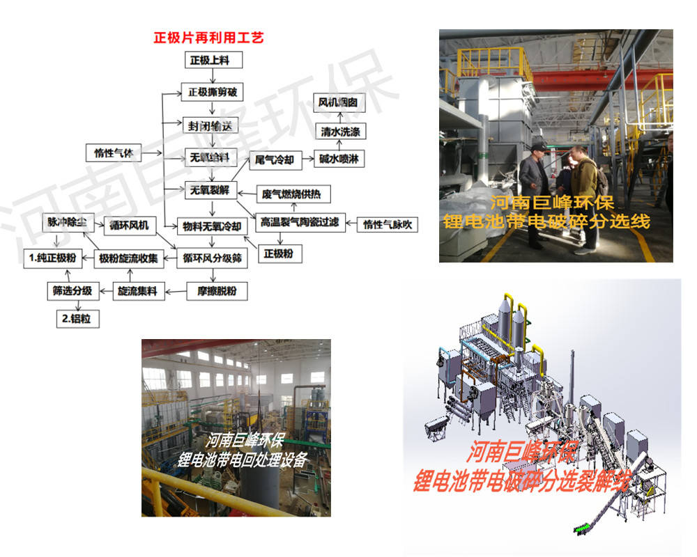 廢舊鋰電池回收處理設備采用新型處理技術,主要技術是在無氧的條件下去去進行一系列的撕碎,破碎,通過無氧給料進入無氧裂解系統,讓惰性氣脈沖設備和高溫裂解氣陶瓷過濾反應廢氣燃燒供熱循環利用。高速旋轉的磨塊與齒圈形成碰撞、摩擦、剪切多種力作用下粉碎,并將活性物質與集流體剝離,其中集流體難于粉碎,無法通過分級輪,落入粉碎機底部,由導料螺旋排出粉碎機,而活性物質中,粒徑不合格粗料落入粉碎區繼續粉碎;粒徑合格的物料通過分級輪,經循環風篩選機所產生的負壓進入脈沖除塵器中篩選出極粉和鋁粒,現廢舊電池材料的處理且不污染環境。在此過程中,首先從磷酸鐵鋰電池極片廢料破碎后的廢料中制得極粉,然后可循環使用。