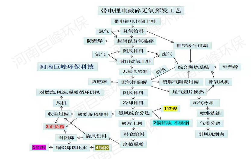 廢電池處理破碎回收工藝分為廢舊鋰電池的上料,貧氧破碎,無氧裂解,分選,摩擦脫粉篩,廢氣綜合利用,廢氣處理凈化等,尾氣處理采用高溫燃燒方式進(jìn)行處理,符合環(huán)保排放要求,尾氣燃燒后的熱量跟二次利用。設(shè)備為可平放,可移動式,無需打地基??扇?xì)赓Y源化利用率高。設(shè)備設(shè)有雙氮?dú)獗卮胧┖头辣到y(tǒng),防止爆炸爆燃的發(fā)生。鋰電池回收設(shè)備每小時可處理1.3-1.6噸左右?guī)щ婁囯姵亍?/span>